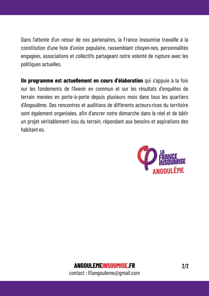 Élection municipale 2026 à Angoulême LFI se prépare et appelle à l’Union Retourner à la page d’accueil